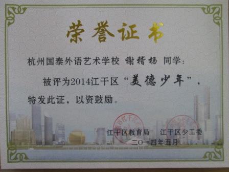 2014年5月,在共青团江干区委、江干区教育局、少先队江干区工作委员会共同组织开展的“红领巾相约中国梦,争做美德少年”主题教育系列活动中,杭州国泰外语艺术学校初一(1)班谢稽杨同学荣获2014年江干区“美德少年”称号。本次评选难度高,把关严,充分展示了国泰学校的实力,这是我校长期重视学生德育工作结出的硕大成果。